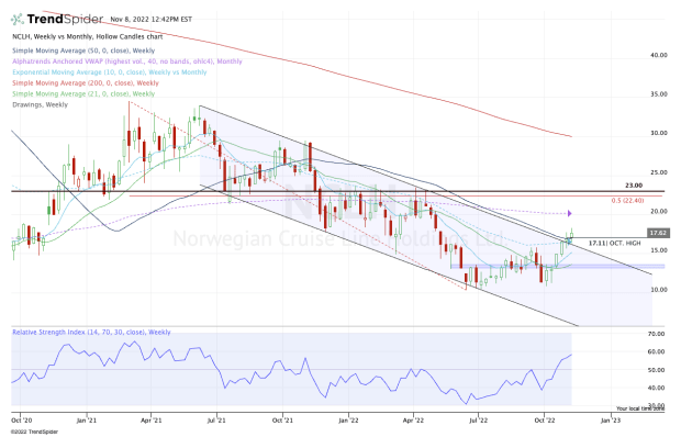 Norwegian Cruise stock enjoyed a nice rally off the 2020 low, but in mid-2021, the stock fell into a long downward channel. That was marked by a series of lower highs and lower lows and can be seen on the weekly chart above.
