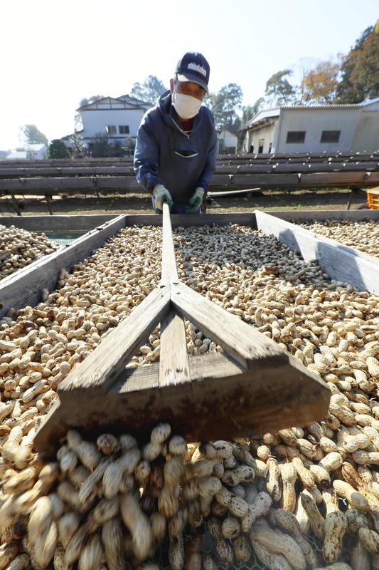 Employees of Masuda Co., a peanut processing company that specializes in sun drying its legumes, spreads freshly harvested and washed peanuts on a net on Tuesday to allow them to air-dry. Masuda Chairman Shigeru Masuda, 79, said that although demand has declined because of the pandemic, the company will do its best to sell more peanuts toward the end of the year when demand will grow.