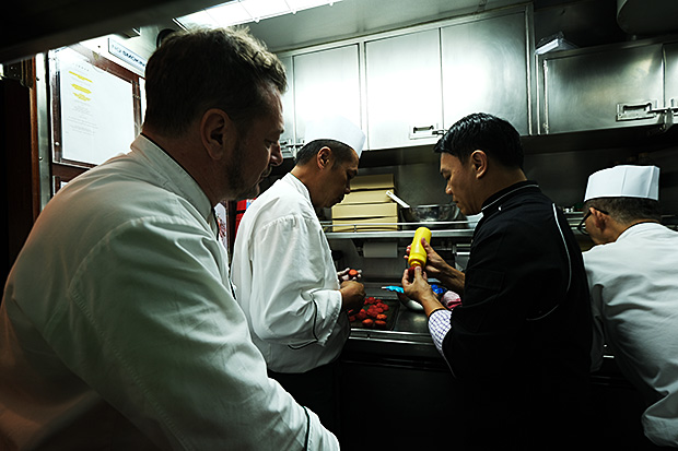There are 10 chefs who work on the menu, with eight on-board at any given time. They work in shifts: six in the morning, six in the evening and two on the graveyard shift. "The kitchen runs 24 hours," explained chef Martineau.