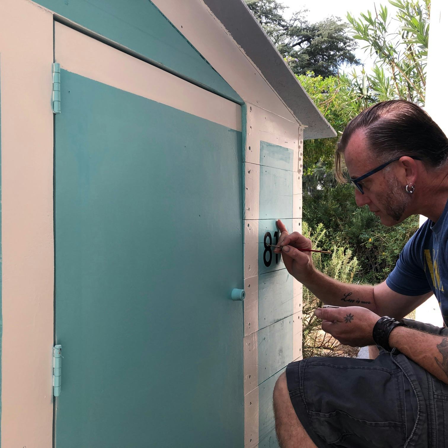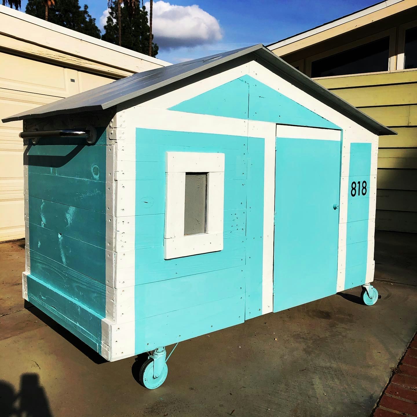 The house Gano built looks like a single-level home miniaturized and on wheels: there’s a window, a slanted roof, and it’s painted robin's egg blue. The three-by-six structure had a “mid-century inspiration — not only that this is a mid-century modern architecture neighborhood — but that particular style of architecture, with the roofline the way it is, really lends itself to a spacious, open kind of feeling,” he says. As a local touch, Gano painted “818” near the door, a shout-out to his local area code.