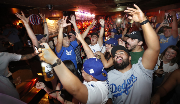 A few miles from the stadium, the Down and Out bar in downtown L.A. _ equipped with a floor-to-ceiling projector screen _ rocked with screaming Dodgers fans.