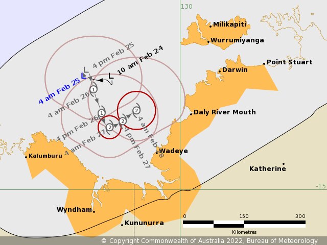 She said the system was now sitting about 320 kilometres west of Darwin after edging further west overnight, and that it could possibly move south towards the Kimberley or east towards the Top End over the coming days.