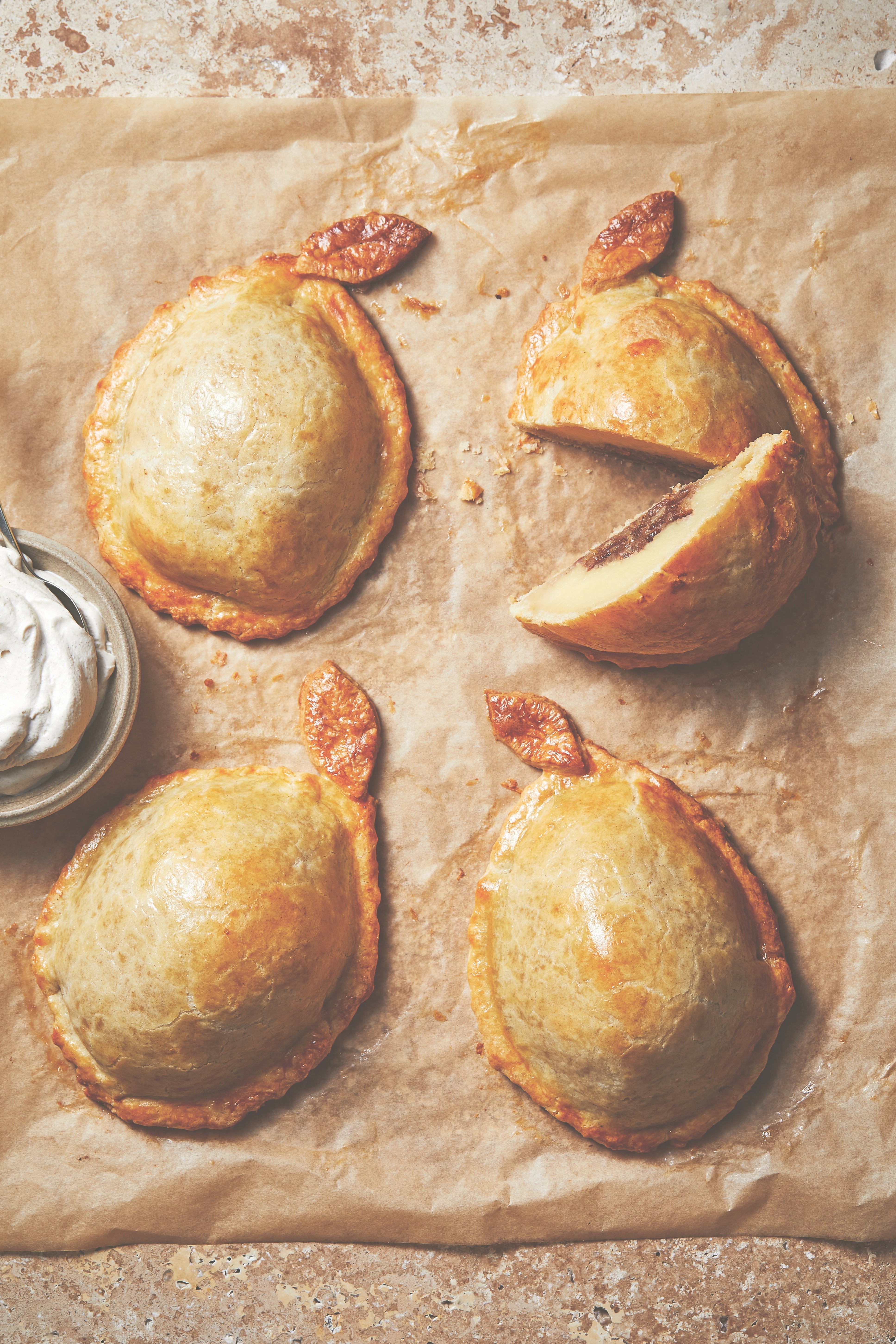 7. Brush each pie with beaten egg. Bake for 25-30 minutes until golden brown. They can be eaten hot or cold with cinnamon cream or custard.