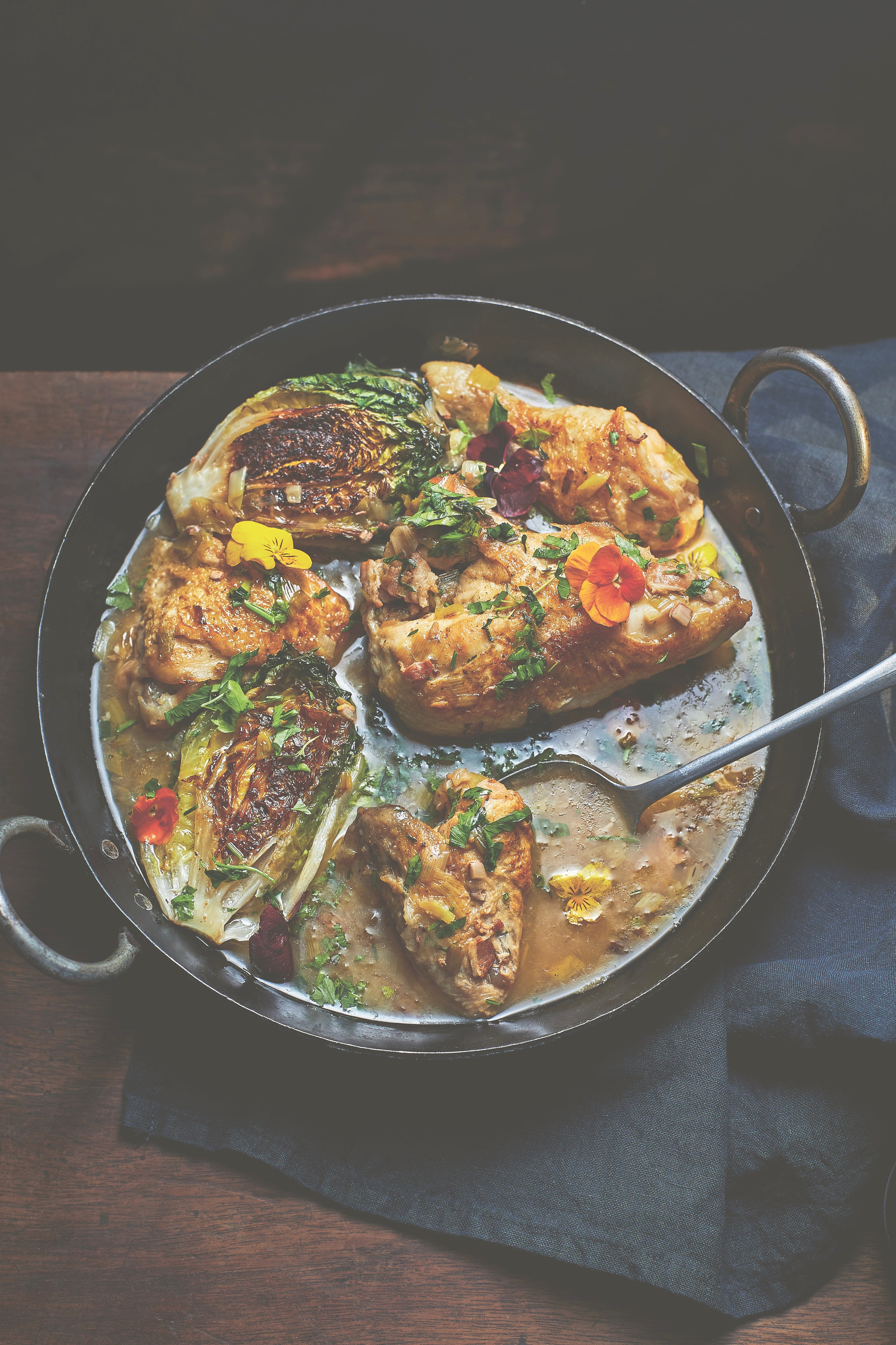 6. Remove the lemon slices from the sauce (they’ve done their work). Nestle the browned lettuce halves among the chicken portions. Cook for a further 5–10 mins or until the chicken is cooked. Adjust seasoning then serve scattered with the chopped herbs and edible flowers.