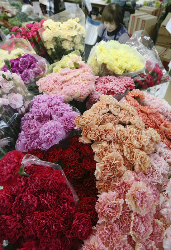 Shipments of carnations are in full swing in Nishio, Aichi Prefecture, on Wednesday, as Mother's Day approaches on May 13. Workers at the Japan Agricultural Cooperatives' local workshop were busy checking for insects, and cutting and boxing the flowers. Growth was slow due to bad weather in October and cold winter temperatures, but warm days from March accelerated the flowers' blossoming.