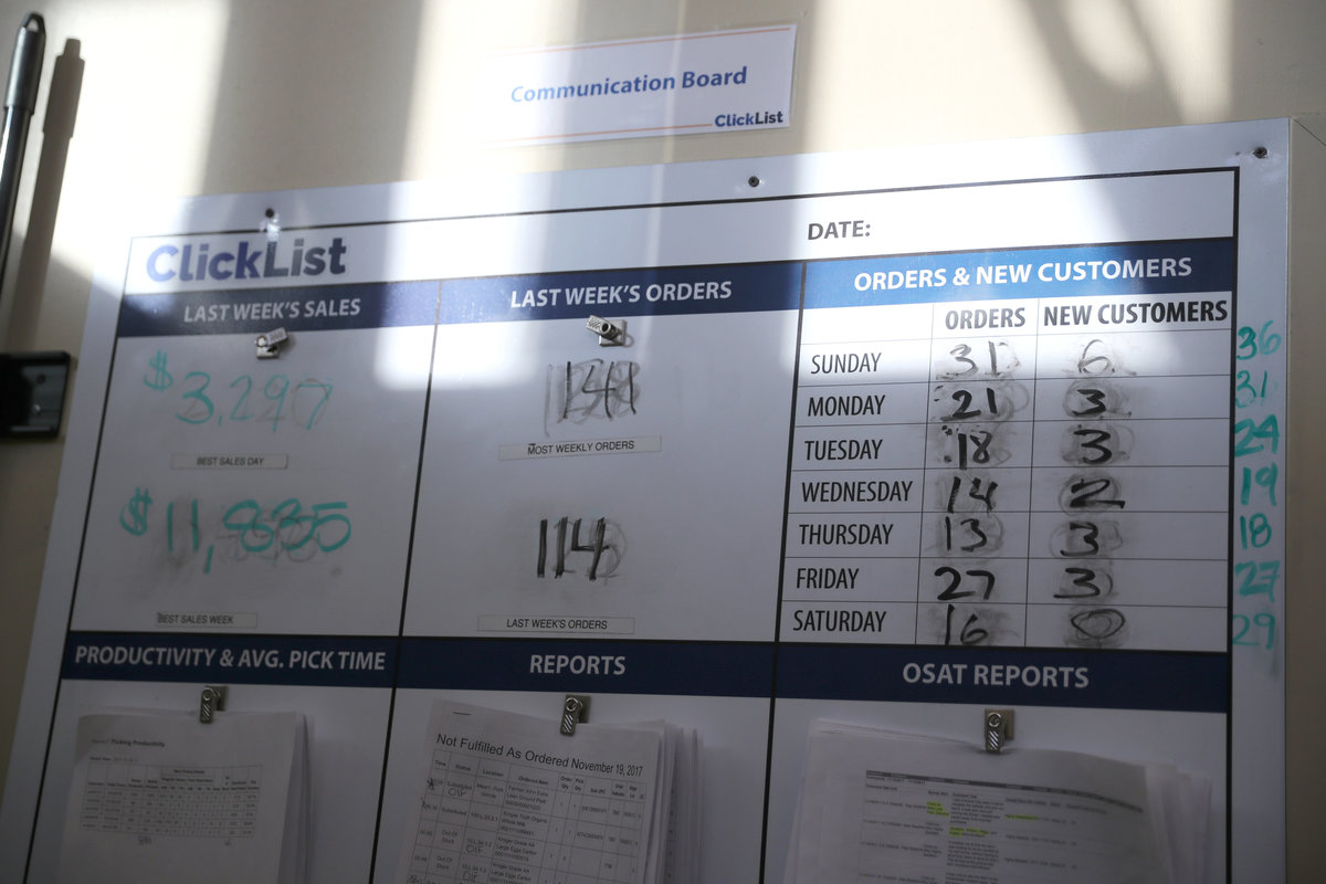 Miguel Lopez, who leads the ClickList team there, said it takes about 30 minutes to pick a $100 order; a $400 order takes an hour. The team tracks progress on a white board that showed weekly progress since the service debuted in January. The number of daily orders ranged from 13 to 36. Sales for the week Reuters visited, which included Thanksgiving Day, were on pace to hit a record of more than $12,000.