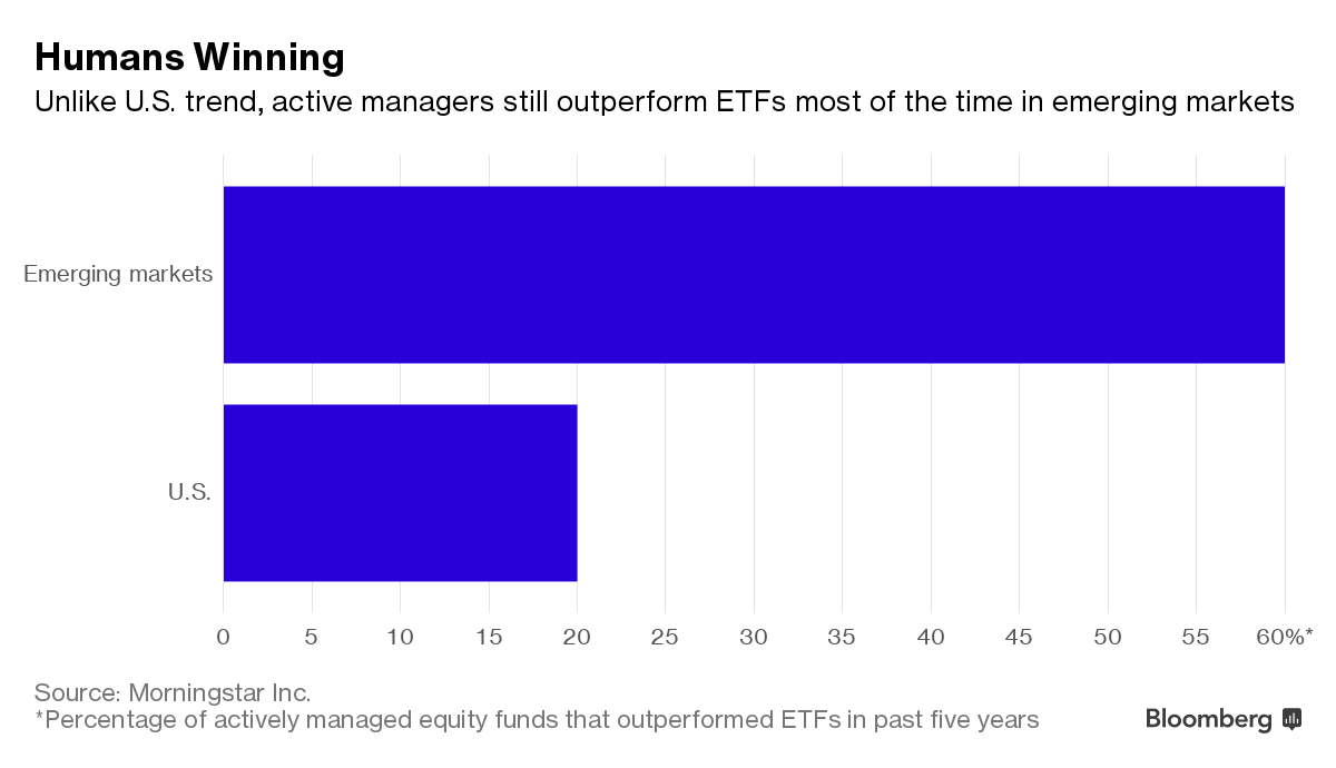 And it can be a challenge. While Marshall-Lee is outperforming, more than a third of the 358 others tracked by Morningstar trailed ETFs. In the 10 years through 2016, four out of every 10 emerging-market equity funds flopped, according to S&P Dow Jones Indices’ SPIVA Scorecord report for 2016 comparing active and passive investments.