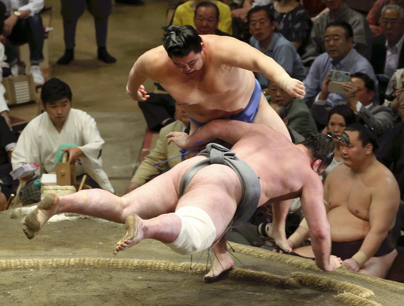 As Georgia's national flag went up among the cheering onlookers, the sekiwake went down to No. 4 maegashira Shodai (8-5) in a ferocious battle. Shodai pulled Tochinoshin down near the bales, and the sekiwake's right hand touched down as he went diving outside the ring.
