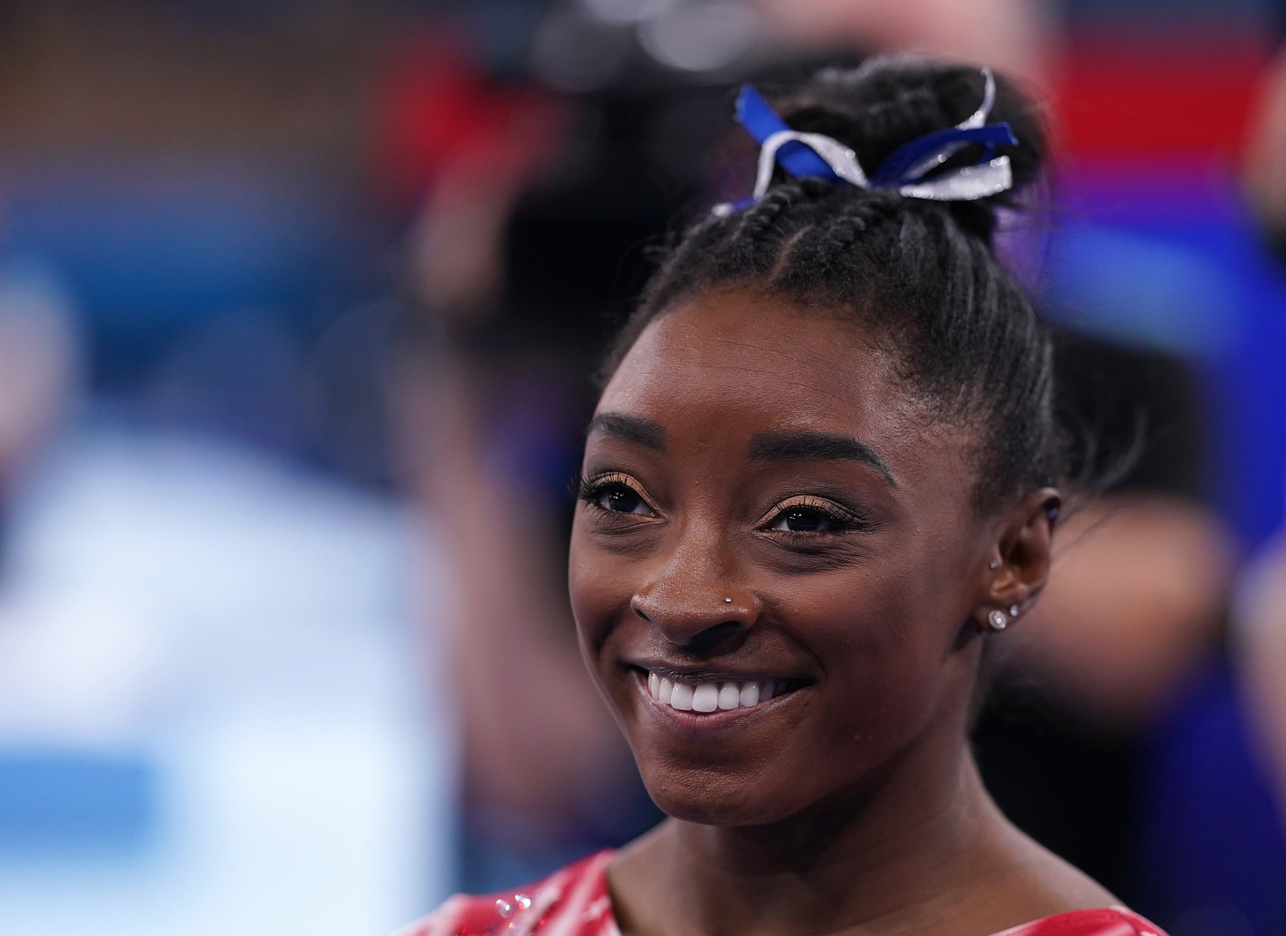 Biles beaming with a bronze