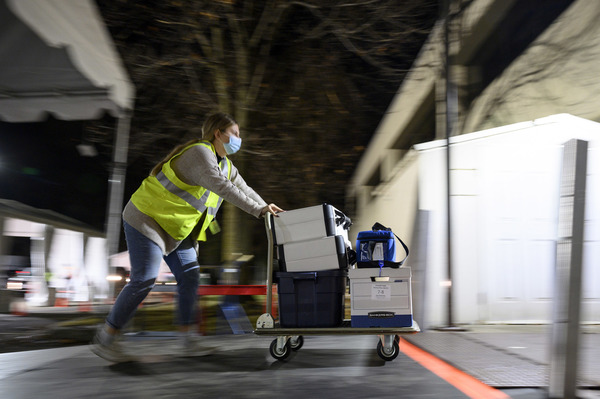 Anna Baish, a volunteer and student at the University of Minnesota, pushed a dolly holding completed ballots and election equipment into the warehouse at the Ramsey County Elections Office on Tuesday, Nov. 3, 2020, in St. Paul, Minnesota. (Aaron Lavinsky/Minneapolis Star Tribune/TNS)