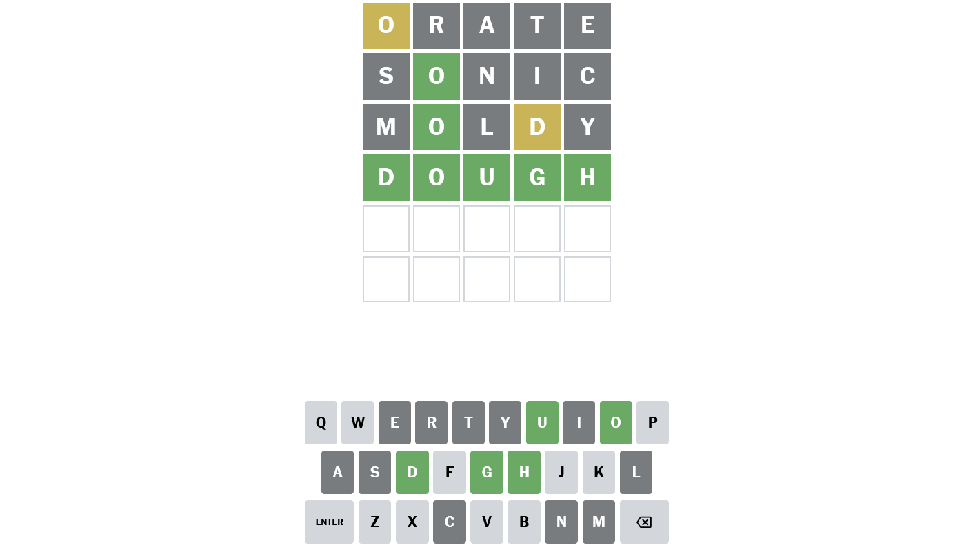 I opted for MOLDY next, and finally I made some progress. 'D' turned yellow, leaving only one possible answer.