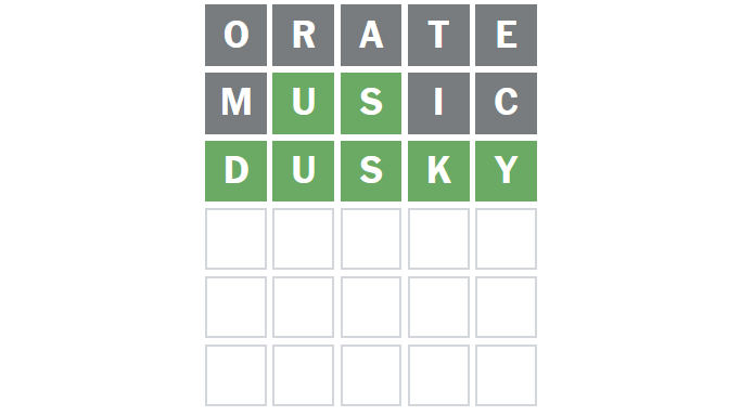But I beat those 8/1 odds by playing DUSKY. It turned my three remaining mystery letters green, giving me an unlikely three-turn win.