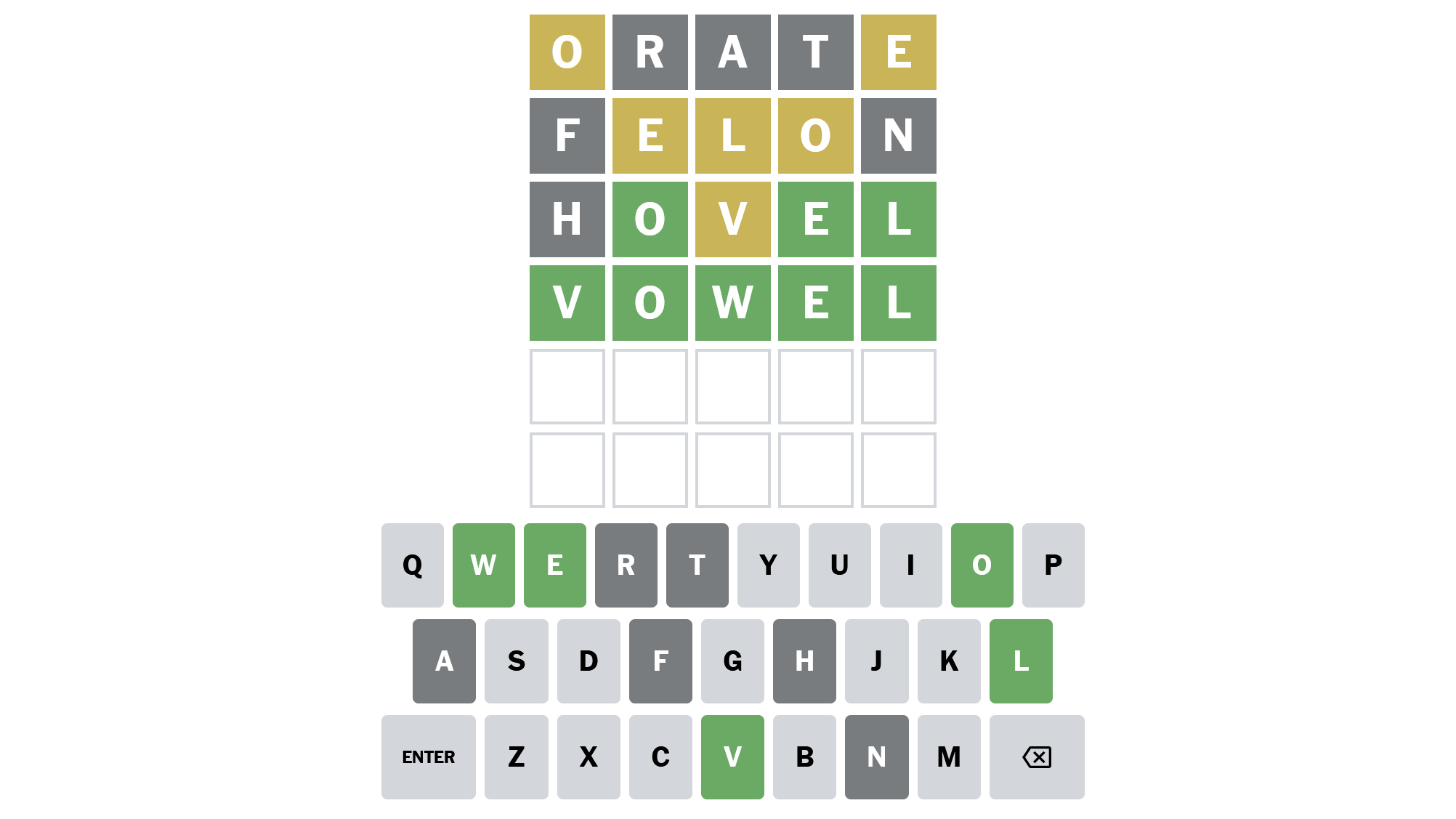 I tried HOVEL next, which was a real winner. My three existing letters turned green, while 'V' went yellow.