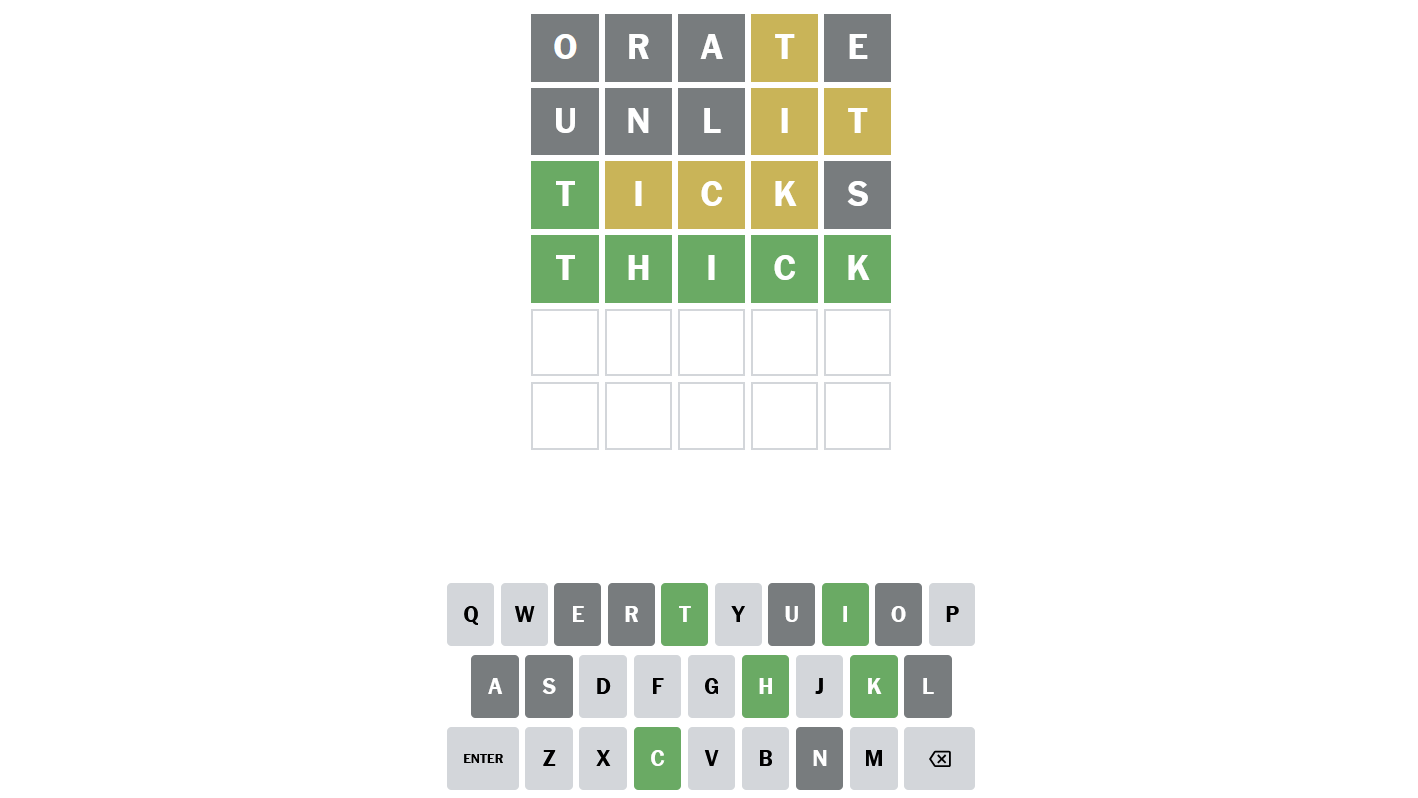 'T' turned green, while 'I', 'C' and 'K' were all yellow, leaving only one possible answer.