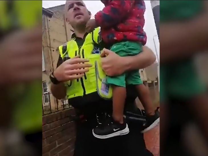 In the video, the police officer is seen holding out a hand to the toddler before picking him up. The young boy begins to cry when he is asked where his house and his mother is.