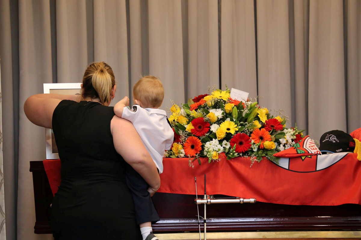 A mug placed on the coffin had a picture of father and son stick figures and the inscription: "Daddy I love you to the moon and back!"