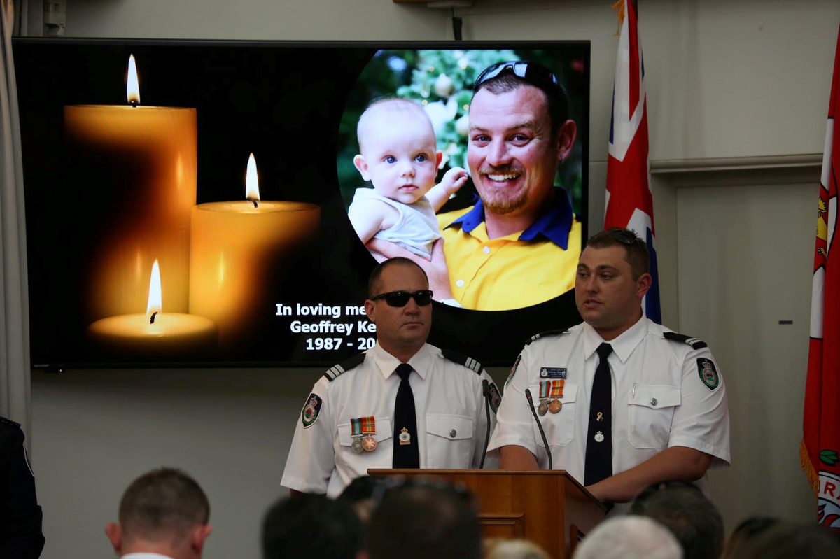Nineteen-month-old Harvey Keaton stood quietly, sucking on a pacifier, as the fire service commissioner pinned a posthumous commendation for bravery and service to his neatly pressed, oversized Rural Fire Services (RFS) shirt.
