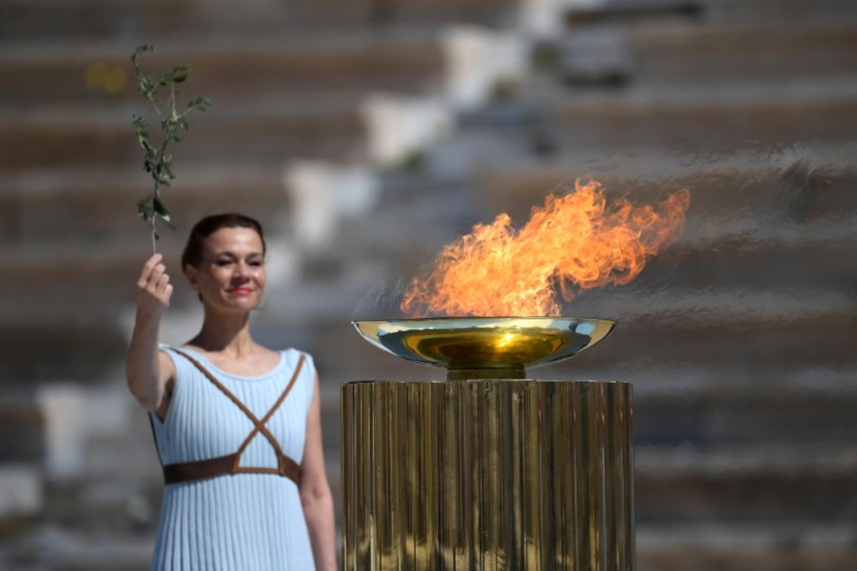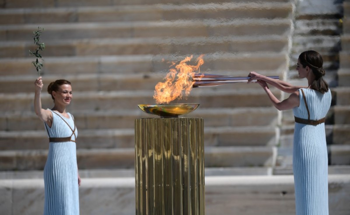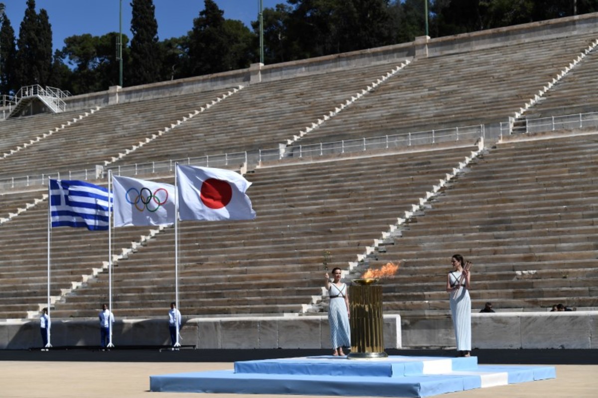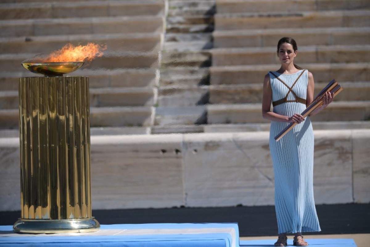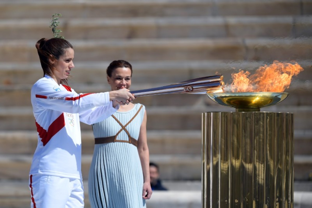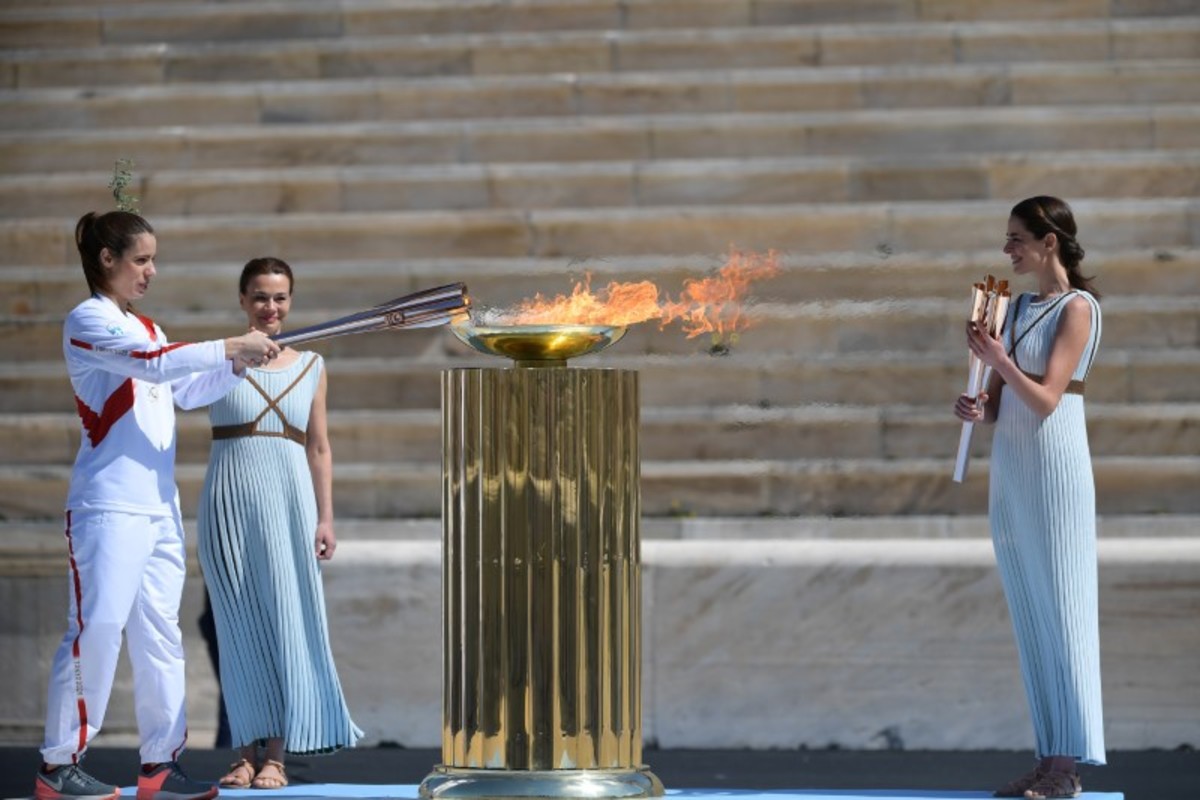 Olympics - Olympic Flame Handover Ceremony - Panathenaic Stadium, Athens, Greece - March 19, 2020 Greek actress Xanthi Georgiou hands over the Olympic torch to Greek Sports Minister and HOC President Spyros Capralos during the olympic flame handover ceremony for the 2020 Tokyo Summer Olympics Aris Messinis/Pool via REUTERSOlympics - Olympic Flame Handover Ceremony - Panathenaic Stadium, Athens, Greece - March 19, 2020 An athlete lights the Olympic torch during the olympic flame handover ceremony for the 2020 Tokyo Summer Olympics Aris Messinis/Pool via REUTERSOlympics - Olympic Flame Handover Ceremony - Panathenaic Stadium, Athens, Greece - March 19, 2020 A perfomer stands next to the Olympic flame during the olympic flame handover ceremony for the 2020 Tokyo Summer Olympics Aris Messinis/Pool via REUTERSOlympics - Olympic Flame Handover Ceremony - Panathenaic Stadium, Athens, Greece - March 19, 2020 Greek actress Xanthi Georgiou lights the Olympic torch during the olympic flame handover ceremony for the 2020 Tokyo Summer Olympics Aris Messinis/Pool via REUTERSOlympics - Olympic Flame Handover Ceremony - Panathenaic Stadium, Athens, Greece - March 19, 2020 Former Japanese swimmer Imoto Naoko holds the Olympic torch during the olympic flame handover ceremony for the 2020 Tokyo Summer Olympics Aris Messinis/Pool via REUTERSOlympics - Olympic Flame Handover Ceremony - Panathenaic Stadium, Athens, Greece - March 19, 2020 A perfomer stands next to the Olympic flame during the olympic flame handover ceremony for the 2020 Tokyo Summer Olympics Aris Messinis/Pool via REUTERSOlympics - Olympic Flame Handover Ceremony - Panathenaic Stadium, Athens, Greece - March 19, 2020 Greek actress Xanthi Georgiou stands by the olympic flame during the olympic flame handover ceremony for the 2020 Tokyo Summer Olympics Aris Messinis/Pool via REUTERSOlympics - Olympic Flame Handover Ceremony - Panathenaic Stadium, Athens, Greece - March 19, 2020 An athlete lights the Olympic torch during the olympic flame handover ceremony for the 2020 Tokyo Summer Olympics Aris Messinis/Pool via REUTERS