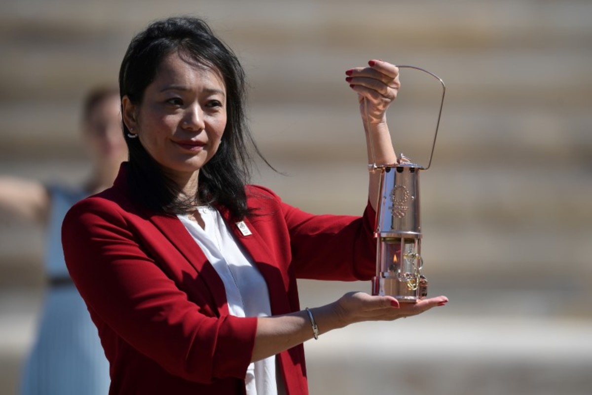 Olympics - Olympic Flame Handover Ceremony - Panathenaic Stadium, Athens, Greece - March 19, 2020 Former Japanese swimmer Imoto Naoko holds the Olympic flame during the olympic flame handover ceremony for the 2020 Tokyo Summer Olympics Aris Messinis/Pool via REUTERS