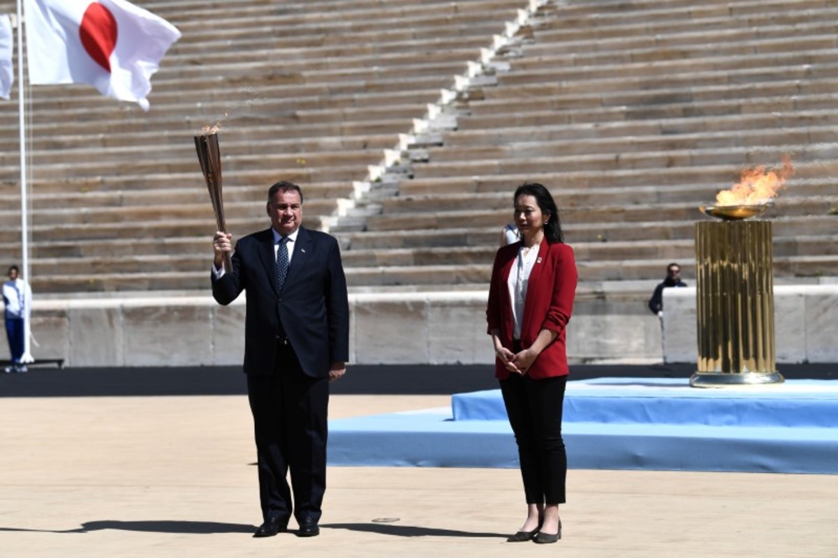 Greece's Olympic Committee chief Spyros Capralos handed over the lit torch to the Japanese former Olympic swimmer Imoto in front of empty stands inside the vast 50,000-capacity horseshoe-shaped marble stadium.