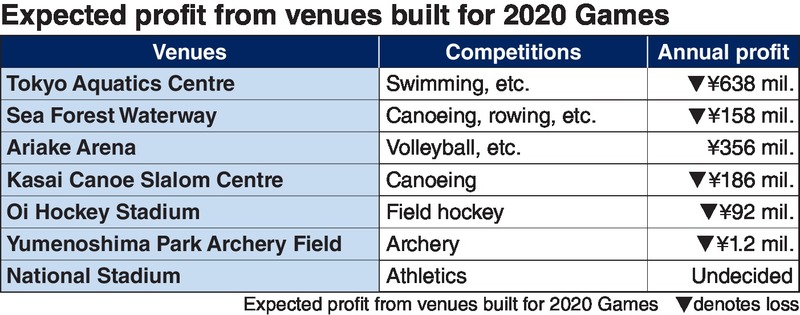 The Tokyo metropolitan government built six facilities for swimming, hockey, canoeing and other sports at a sum of 137.5 billion yen. Of those venues, Ariake Arena in Koto Ward is the only facility expected to be in the black, as it can host concerts and other events.