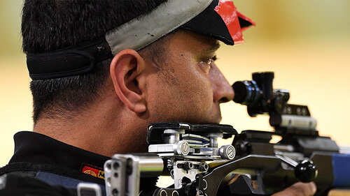 <p>Sanjeev Rajput in action during the men's 50m air rifle 3 positions qualification event at the Tokyo Olympics. Rajput and Aishwary Pratap Singh Tomar fail to qualify for the final after finishing at 32nd and 21st positions respectively in the qualification round. (Twitter Photo)</p>8/8:Rain halts discus throw final