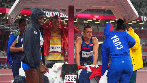 <p>Kristin Pudenz of Germany, Kamalpreet Kaur of India, Sandra Perkovic of Croatia and Yaime Perez of Cuba take shelter due to rain interruption during the women's discus throw final event at the Tokyo Olympics. Kamalpreet finishes at 6th place with a best throw of 63.70m (Reuters Photo)</p>India's undeniable woman power in sports also came to the fore in athletics where discus thrower Kamalpreet Kaur finished a creditable sixth in her first Olympics in a rain-interrupted final.