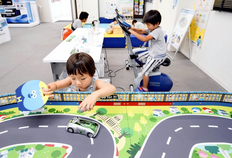 An elementary school boy living in the ward, Kota Moriyasu, 8, pedaled on an exercise bike, generating hydrogen gas to power the miniature car and dragonfly. "I want to try flying a miniature plane powered by hydrogen, too," he said enthusiastically.