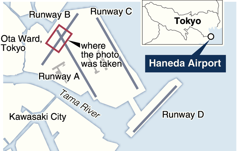 The path stretching horizontally with white lines in the center in the photo of Haneda Airport is Runway B. The path running diagonally in the middle of the image with arrows in the center is Runway A.