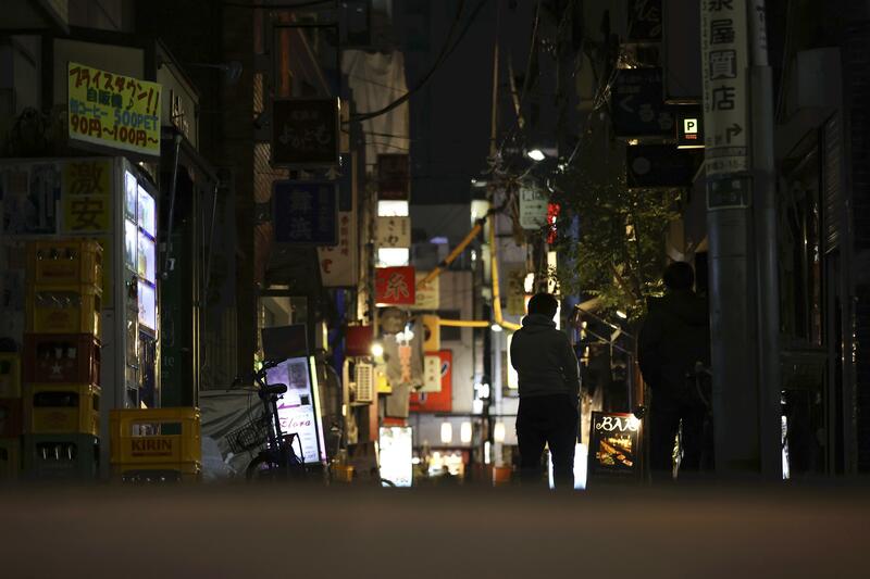 It's after 10 p.m. Monday in an entertainment district in Tokyo. Although dining and drinking establishments adhering to the official request to shut early to help stop the spread of the coronavirus are closed, the lights were still on in several bars.