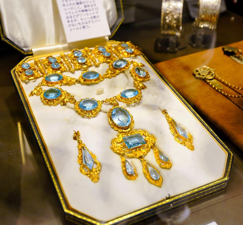Featured is a parure set consisting of a necklace, ring and other items made in Britain in the 19th century. A large, aqua blue stone in a gold-colored setting looks like a sapphire, but is actually made of glass. The setting is made from an alloy. Aristocrats back then were said to have worn genuine jewelry only on important occasions, such as a royal ball. For their nightly parties, costume jewelry sufficed.