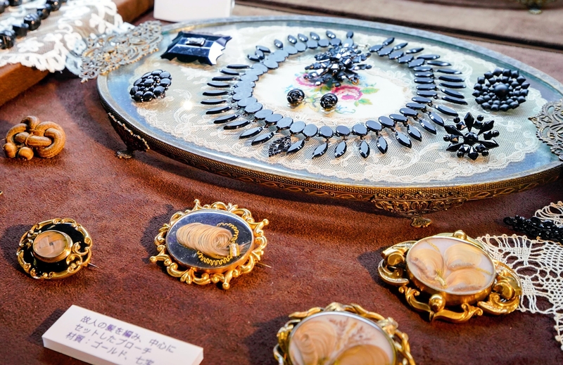 Bulbous items made by glamorous French glass atelier Maison Gripoix were used for necklaces and earrings designed by Chanel and Christian Dior. Also catching the eye is the "mourning jewelry," including brooches and bracelets braided with hair from a deceased family member or loved one.