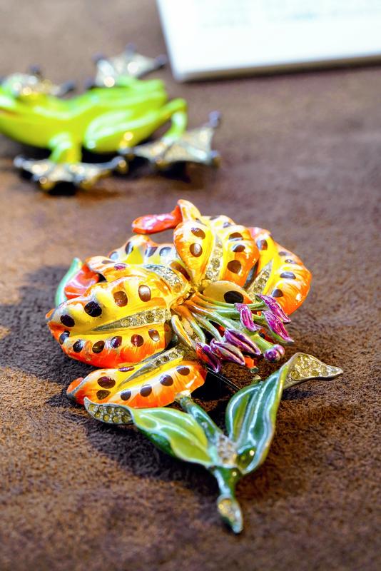 There are also brooches designed by so-called "Queen of Fashion" Coco Chanel (1883-1971) with motifs of flowers and frogs. The items were made by pouring tin into molds and applying them three-dimensionally before being painted.