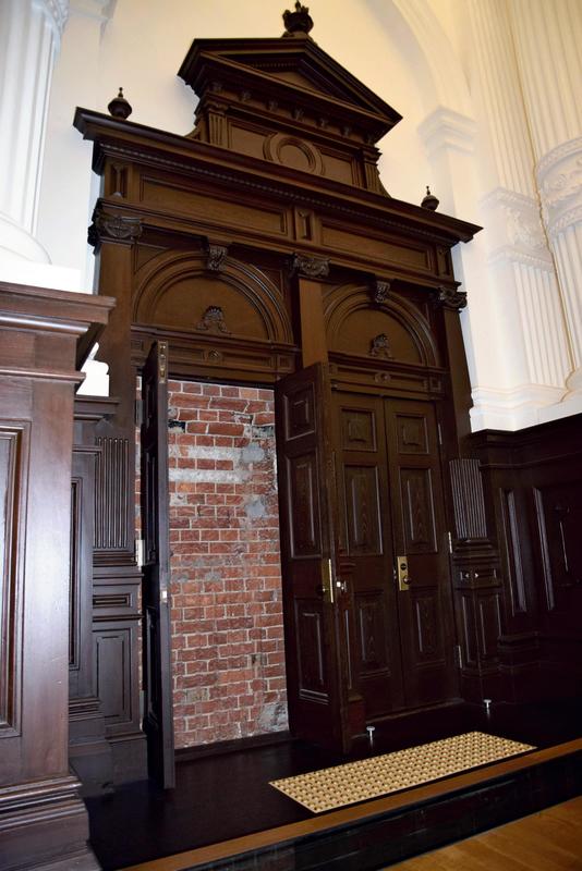 At the Museum on the third floor of the Brick Building, there is a wooden fitting that connects an indoor space with a book storage space, with the door on the right side leading to the book storage. When you open the door on the left side, you will find a brick wall. The bricks date back to the time of the Brick Building's construction.