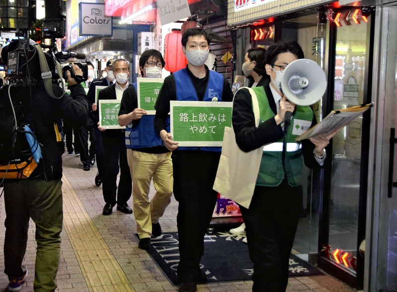 The Tokyo metropolitan government and the Metropolitan Police Department patrolled the downtown area of Kabukicho in Tokyo on Friday, urging people to refrain from drinking on the streets.