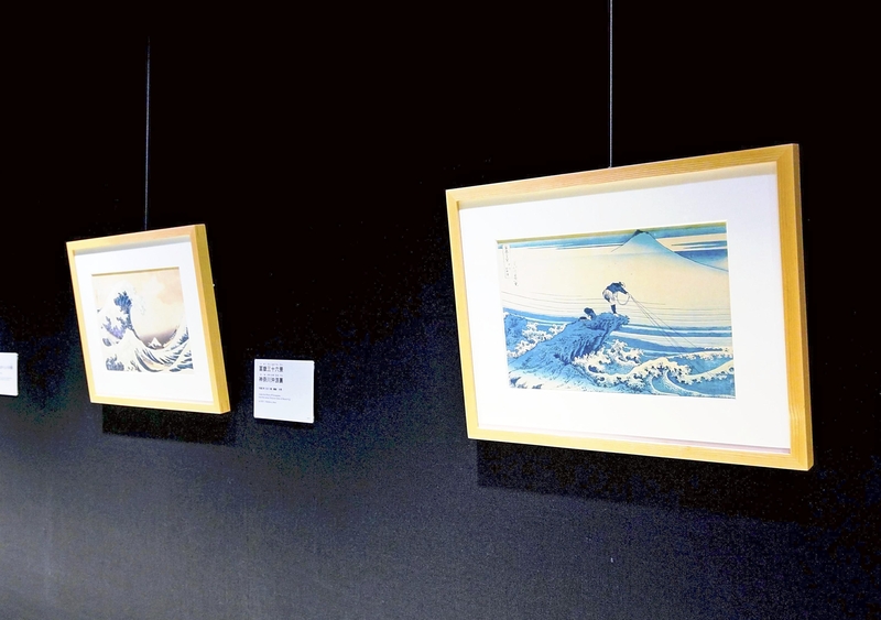 Displayed next to it is "Koshu Kajikazawa," another piece in "Thirty-six Views of Mount Fuji," in which a lone fisherman pulls a net from the raging waves, while Mt. Fuji imposingly stands still in the distance. Many visitors are captivated by the beauty of this scene, rendered in shades of indigo.