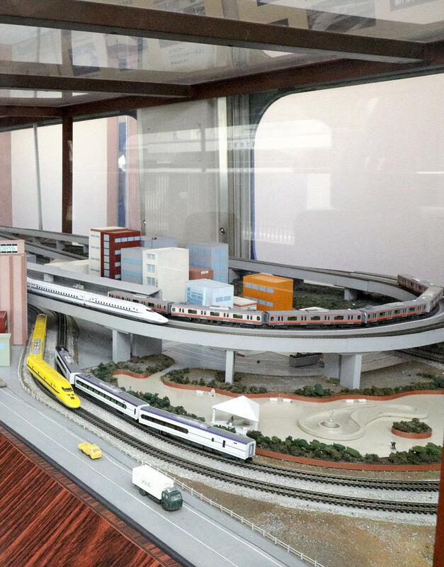 The museum also displays a wooden mold used in experiments to study how winds impact the trains during operation as well as a real Shinkansen train seat, and a diorama of Shinkansen and other trains of existing lines running through an imaginary city.