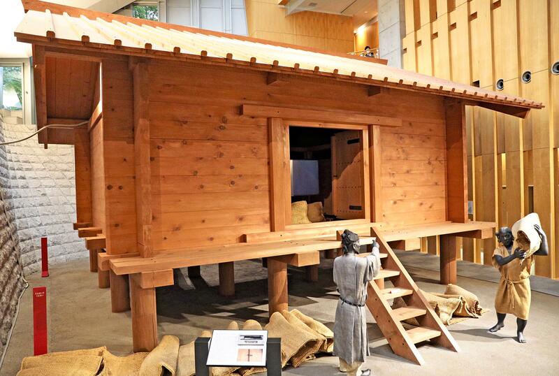 From the museum's entrance on the second floor, visitors step into a permanent collection on the first floor where, in an atrium, a wooden structure measuring about 5 meters tall and 8 meters square is on display. It is a full-scale replica of a shoso, a storage unit used for unhulled rice that was collected as tax during the Nara period (710-784). The shoso storage unit is believed to have been built around the area, which was at one point called the Toshima-gun county of the Musashi-no-kuni domain. A life-size figure of a villager carrying a bag of unhulled rice stands in front of the store house, giving visitors a glimpse at a bygone lifestyle from another time.