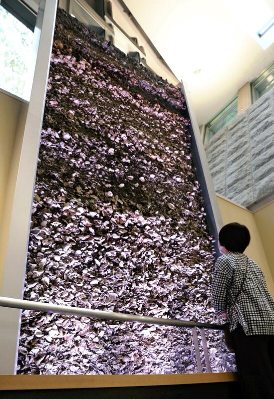 Also on display is a cross-section specimen of a shell mound, which was excavated from the Nakazato Kaizuka shell mound, located between Tabata Station and Kami-Nakazato Station, from the mid-Jomon period. Visitors can get an up-close view of oyster and hamaguri clam shells in the shell mound.