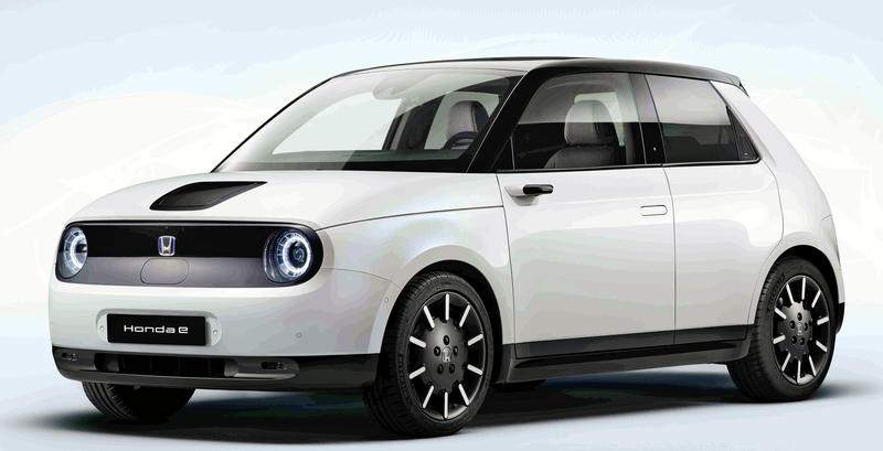 The futuristic Honda e, a small EV to be shown by Honda Motor Co., is likely to attract attention as a mass-production model to be released next year. Its instrument panel is equipped with a large two-screen touch-sensitive monitor, and uses a "camera mirror system" that replaces the side mirrors with cameras.