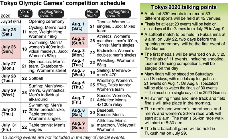 The opening ceremony will begin at 8 p.m. on July 24. Gymnastics and wrestling matches are among competitions in which Japanese players are expected to turn in good performances. The men's gymnastics team final will be held on July 27, with the Japanese team aiming to win their second consecutive Olympic title.