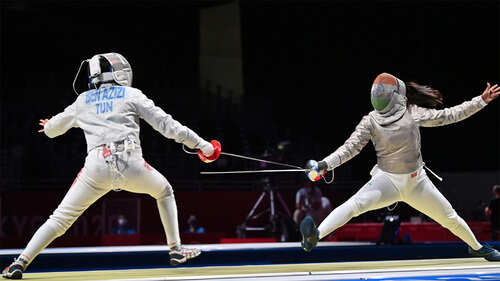<p>Tunisia's Nadia Ben Azizi (left) competes against Bhavani Devi in the women’s individual sabre qualifying bout at the Tokyo Olympics. Bhavani Devi loses 7-15 against the world No. 3 Manon Brunet of France in Round of 32. (AFP Photo)</p>3/10:Archers fail to breach Korean wall