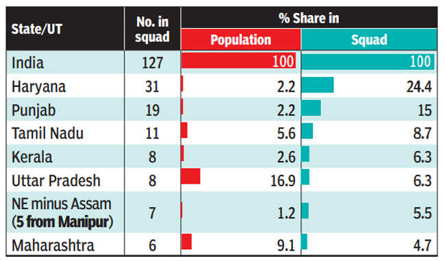 For Haryana, nine of 19 women hockey players, seven wrestlers (four women, three men), four boxers (three men, one woman) and four shooters (two women, two men) make up most of the numbers.