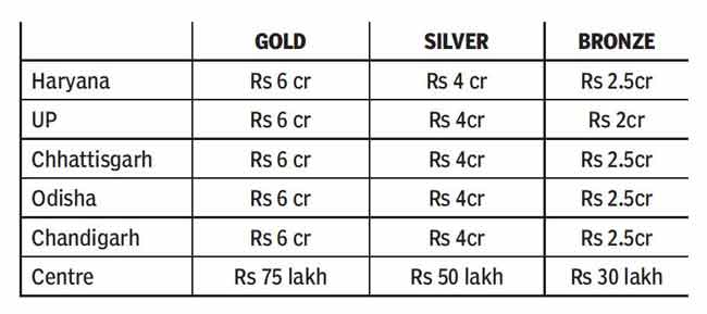 While Haryana, Odisha and Chhattisgarh have announced Rs 4 crore and Rs 2.5 crore for their silver and bronze winners, Chandigarh and UP are will give Rs 4 crore and Rs 2 crore for silver and bronze.