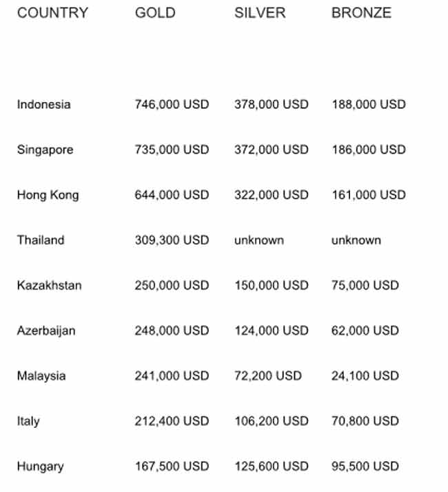 Besides India, the top-5 nations giving cash bonuses for medals are: Indonesia ($746,000, Rs 5.55cr), Singapore ($735,000, Rs 5.47cr), Hong Kong ($644,000, Rs 4.80cr), Thailand ($309,300, Rs 2.30cr), Kazakhstan ($250,000, Rs 1.86cr). All amounts are for gold medals. The figures for silver and bronze medal winners follow a similar trend.