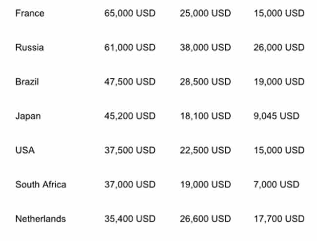 TOI did some number crunching and found out that USA is giving $37,500 (Rs 28 lakh) to its gold winners. Hosts Japan $45,200 (Rs 34 lakh), Russia $61,000 (Rs 45 lakh), France $65,000 (Rs 48 lakh), Germany $22,000 (Rs 16 lakh), Canada $16,000 (Rs 12 lakh), Australia $15,100 (Rs 11 lakh), Netherlands $35,400 (Rs 26 lakh), Brazil $47,500 (Rs 35 lakh) and South Africa $37,000 (Rs 27.5 lakh) to the gold medallists. Only Italy $212,400 (Rs 1.58cr) has a sizeable amount kept for their gold medallists.
