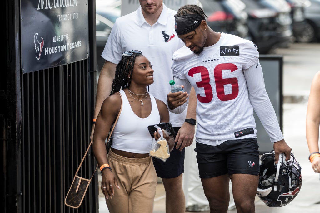 Simone Biles reunited with boyfriend Jonathan Owens back in Texas as she attended his NFL team’s practice in Houston.
