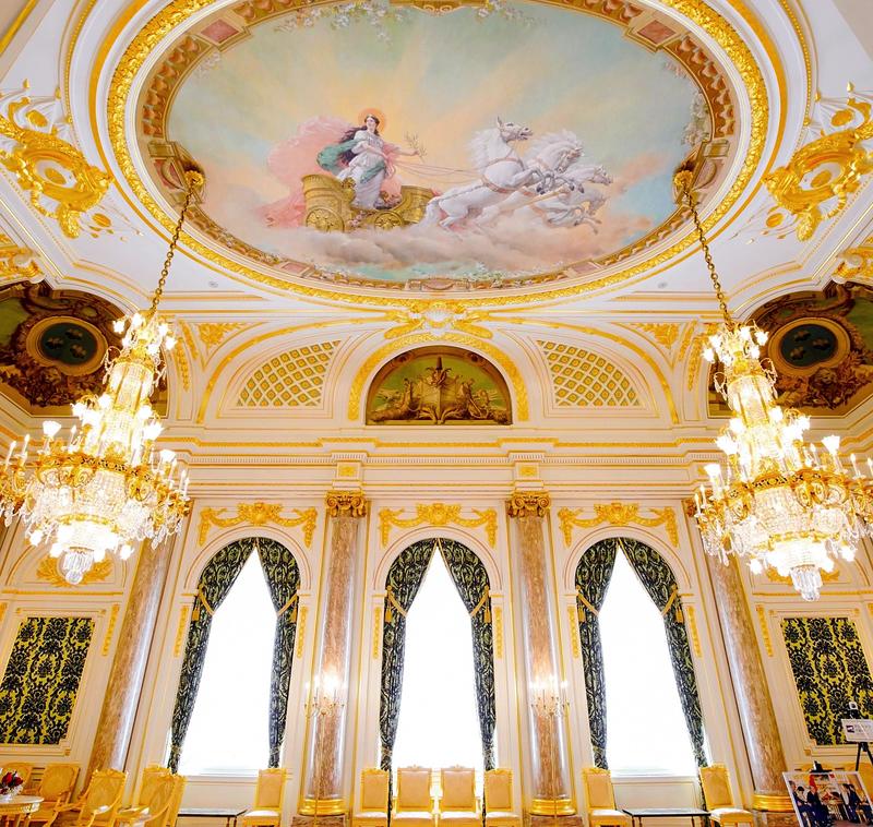 On the ceiling, 24 oil paintings by a French artist, which depict birds and flowers, are installed. Such contrasts between Japanese and Western artistic decorations are seen in many places around the palace.