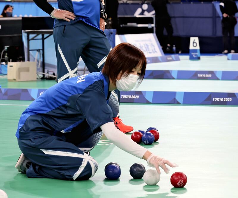 Japan's national boccia team was among those practicing Monday at the sport's Paralympic venue, the Ariake Gymnastics Centre in Koto Ward, Tokyo. Staff wearing disposable plastic gloves picked up balls thrown by players in wheelchairs.