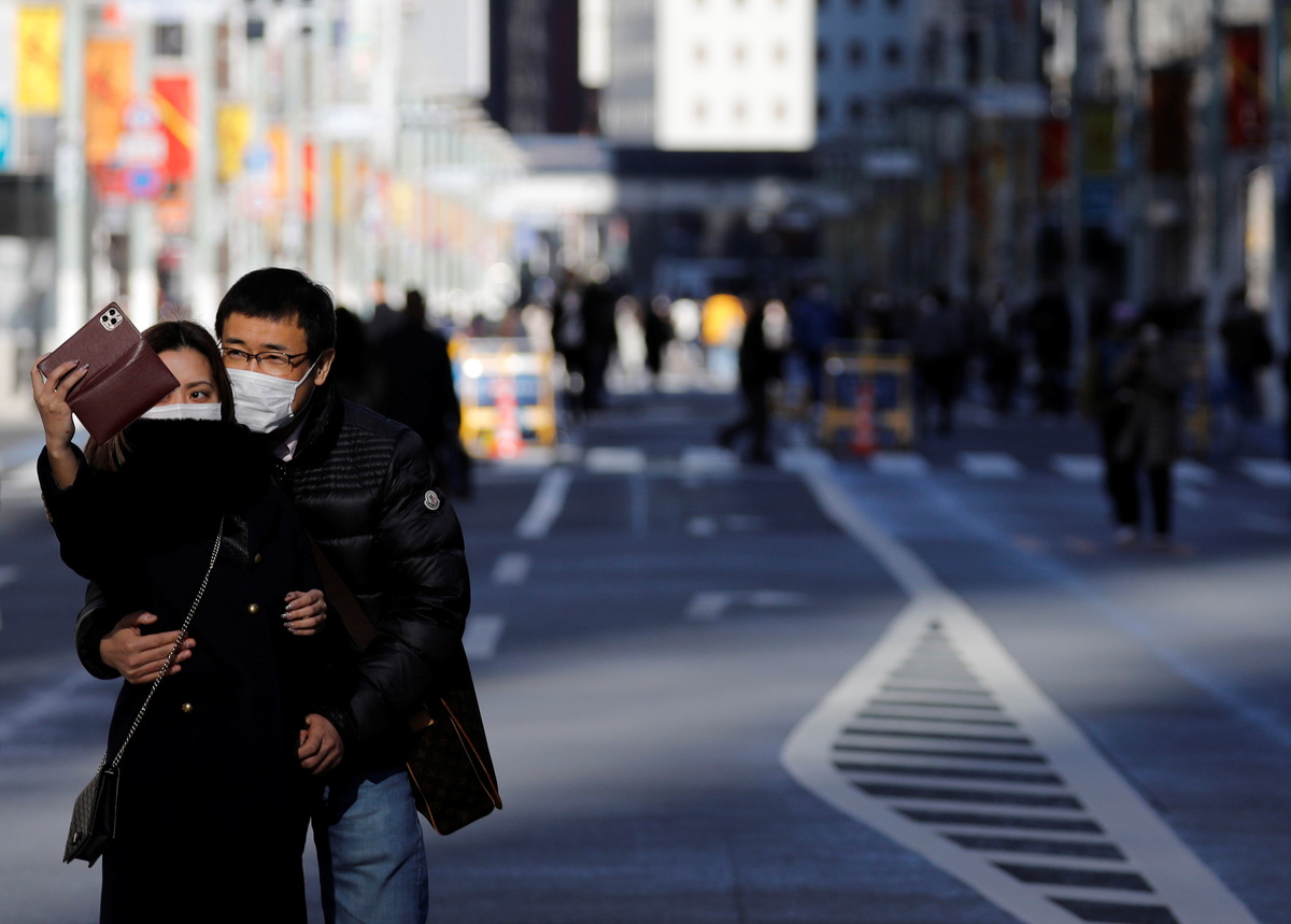 A man and woman wearing protective masks, amid the coronavirus disease (COVID-19) outbreak, take their selfie at Ginza shopping district which closed to cars on Sunday in Tokyo, Japan, January 10, 2021. REUTERS/Kim Kyung-Hoon